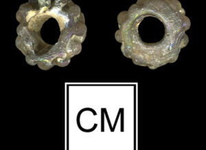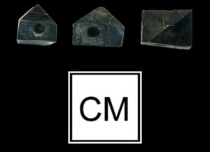 “Jet” refers to the raw material of this unusually shaped bead. Jet is a gemstone quality coal that was carved and polished into a variety of ornaments. Large jet deposits are found in northwestern Spain, where workshops manufactured enormous quantities of objects that were widely distributed throughout Iberia and Spanish colonies.