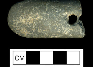 This is a carefully ground and shaped stone artifact. Given its shape and the perforation, it is possibly a pendant.