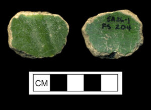 Roughly circular disks chipped from larger pieces of European and Native American pottery are common at St. Augustine and other Spanish colonial sites. These are believed to have been most commonly used as counters in various games, such as backgammon and checkers. This example from the de León site appears to be a preform, not quite completed.