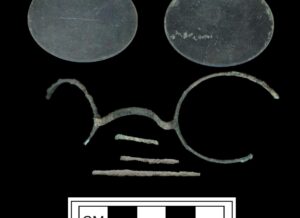 There are European accounts of eyeglasses at least as far back as the 1200s A.D. They were being mass produced by the late 1400s, becoming popular with the invention of the printing press and the increasing availability of printed materials. These spectacle frames from the de la Cruz site are metal, an innovation that did not occur until the 1600s. Earlier frames were made of bone, horn, wood, or leather.