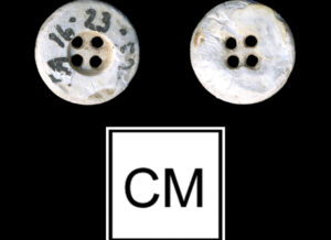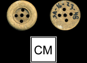 Buttons were made from a variety of materials. Bone buttons, like this one from the de la Cruz site, were common at St. Augustine. The five-hole variety occurs in late 18th-century and early 19th-century contexts.