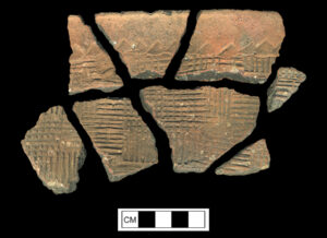 San Marcos is a Native American pottery type characterized by grit temper and complex, impressed surface designs. The designs were applied with a carved wooden paddle before the pot was fired, creating a decorative motif known as complicated stamping. San Marcos is somewhat of an enigma. It first appeared somewhat suddenly after the arrival of Spaniards and was adopted widely by Indigenous groups along the South Carolina, Georgia and Florida coastal regions. But its origins remain debated.