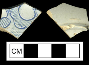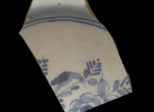 This multi-colored tin glaze ware (typically blue and black designs on a white background, but other colors are reported) was popular from the mid 1600s to early 1700s. It is characterized by a highly decorated painted surface, consisting of scrolls, lobes, curves, and linear motifs.